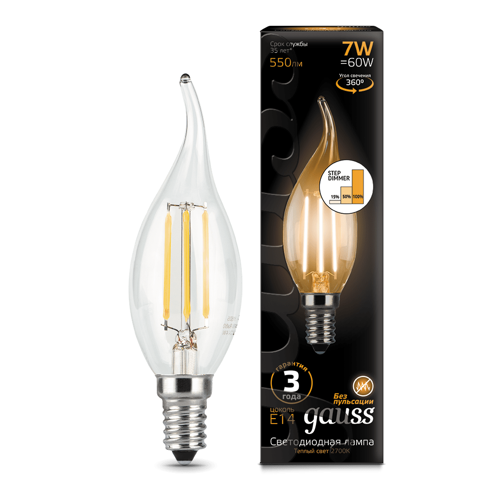 Технические характеристики диммируемой лампы Gauss LED Filament свеча на ветру E14 7W 550lm 2700K